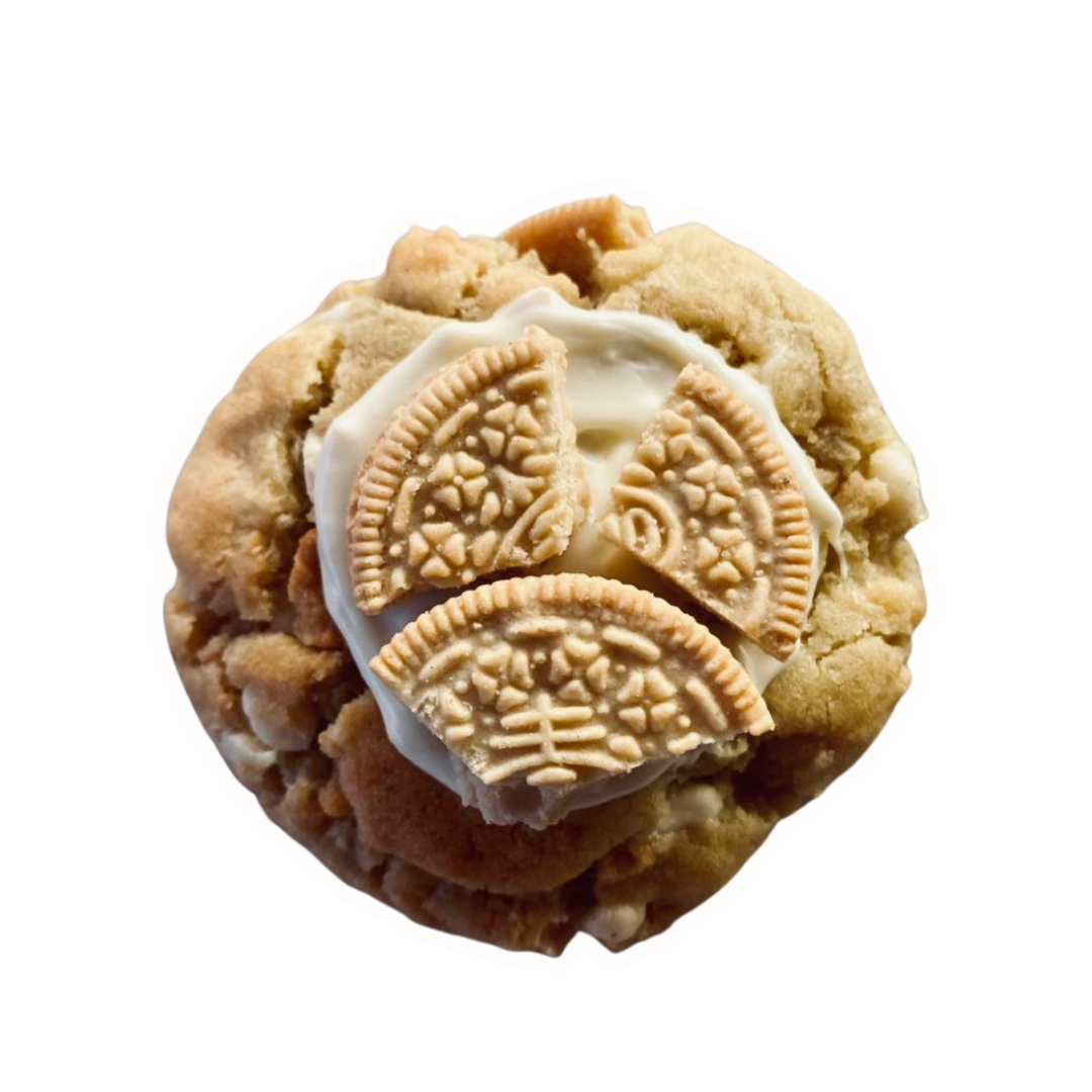 A golden cookie packed with creamy white choc and crunchy Golden Oreo chunks, topped with smooth white chocolate and a Golden Oreo crown.